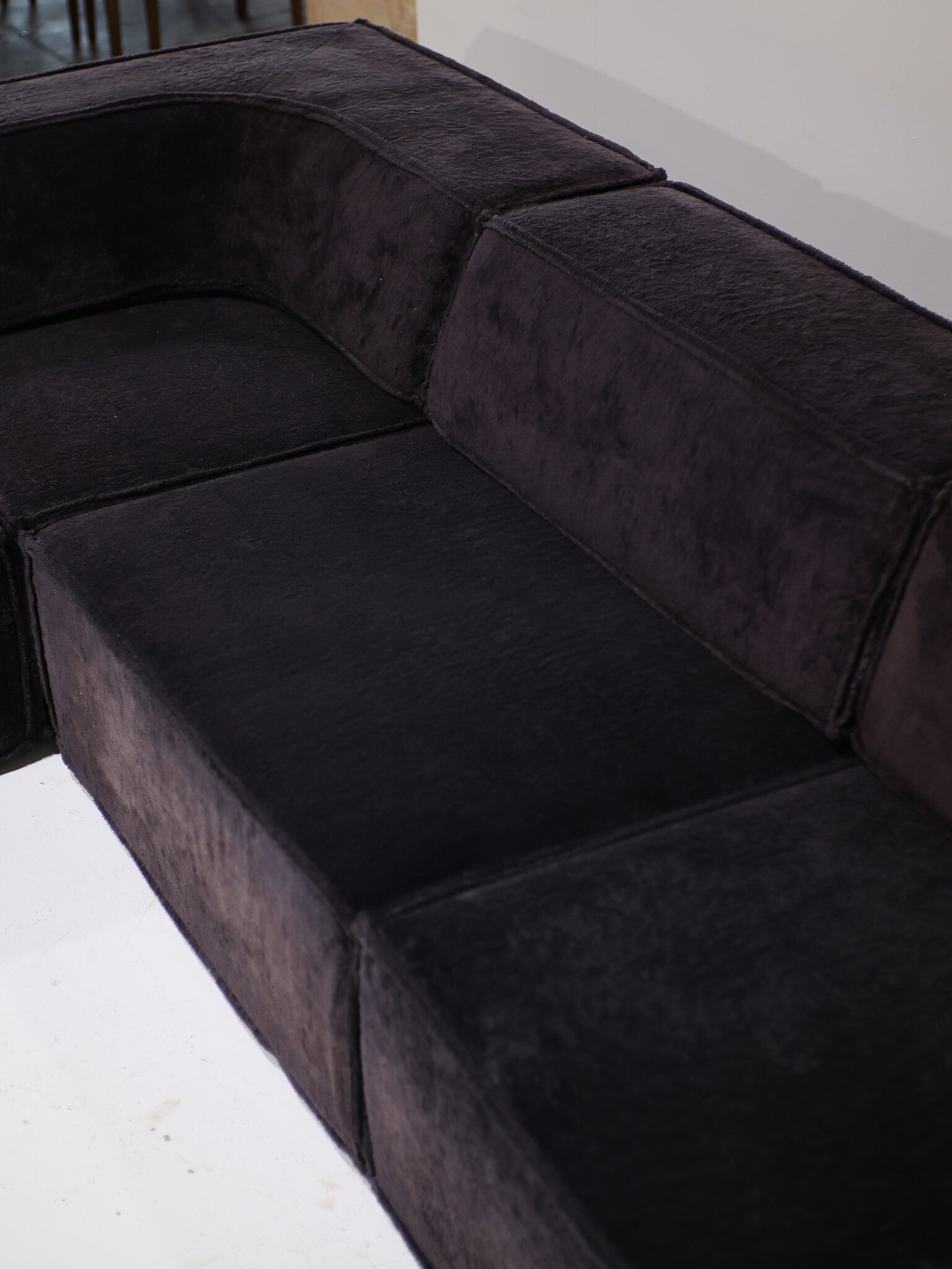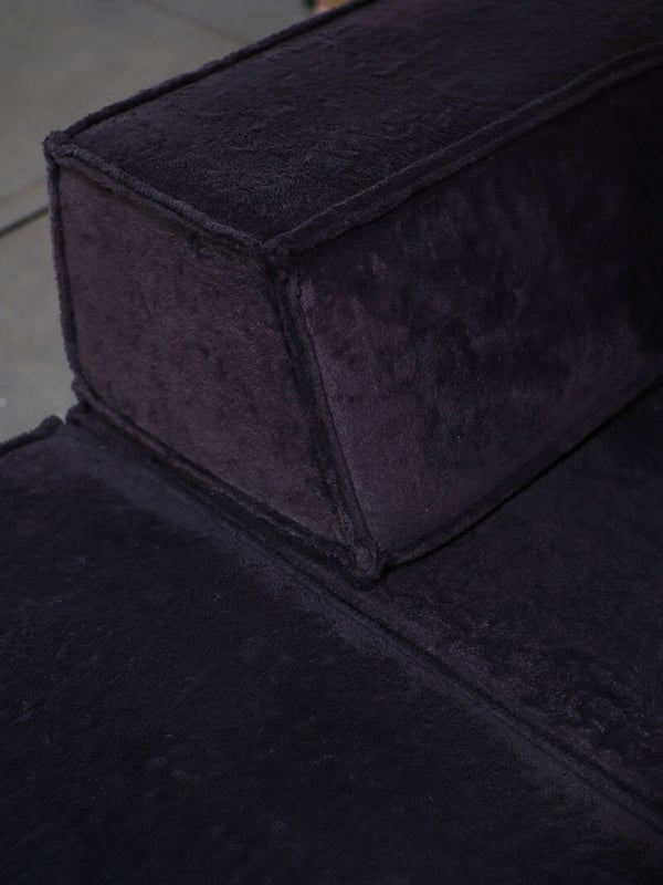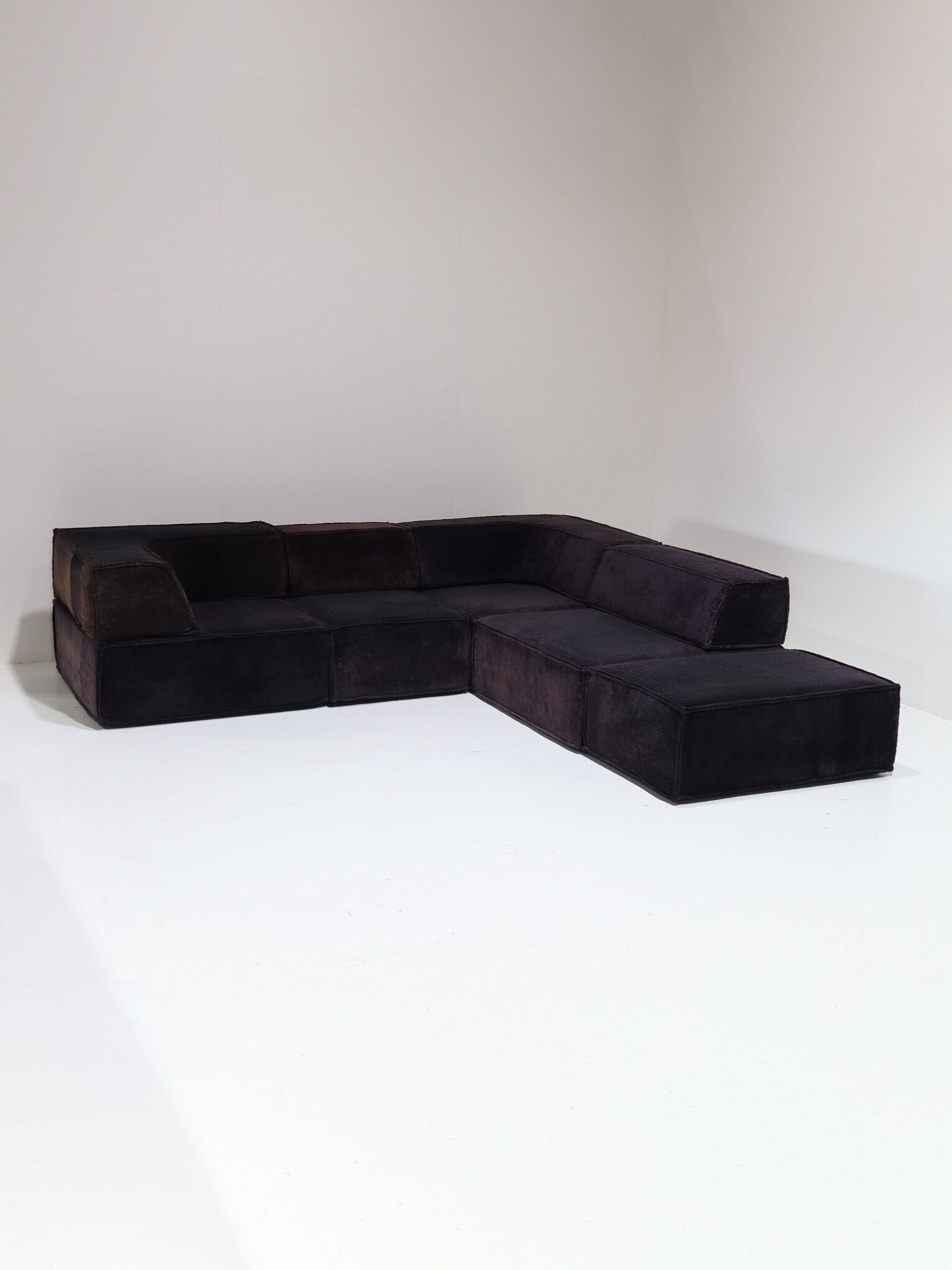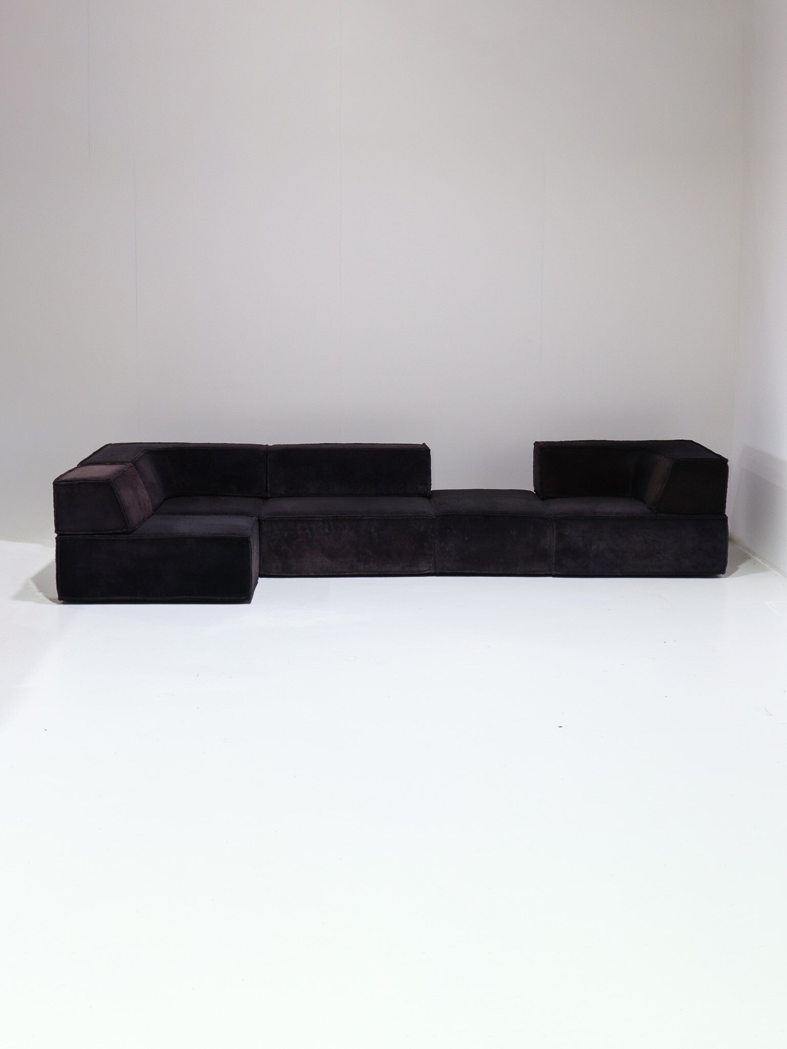 Prachtige elementen 'Trio' sofa ontworpen door Team Form AG voor Cor in Zwitserland, 1973. Deze comfortabele en veelzijdige lounge bank bestaat uit vijf zitelementen, waarvan twee smal, twee rugleuningen en twee hoekleuningen. De mogelijkheden van de Trio zijn eindeloos, doordat de leuningen te verplaatsen zijn. Zo kun je bijvoorbeeld één grote rechte bank maken, een hoekbank, een enorm loungebed of een speels zitlandschap / ziteiland met zitplekken aan twee kanten. Dit vintage exemplaar is bekleed met de originele zachte teddy stof in een donkerpaars-bruine kleur.